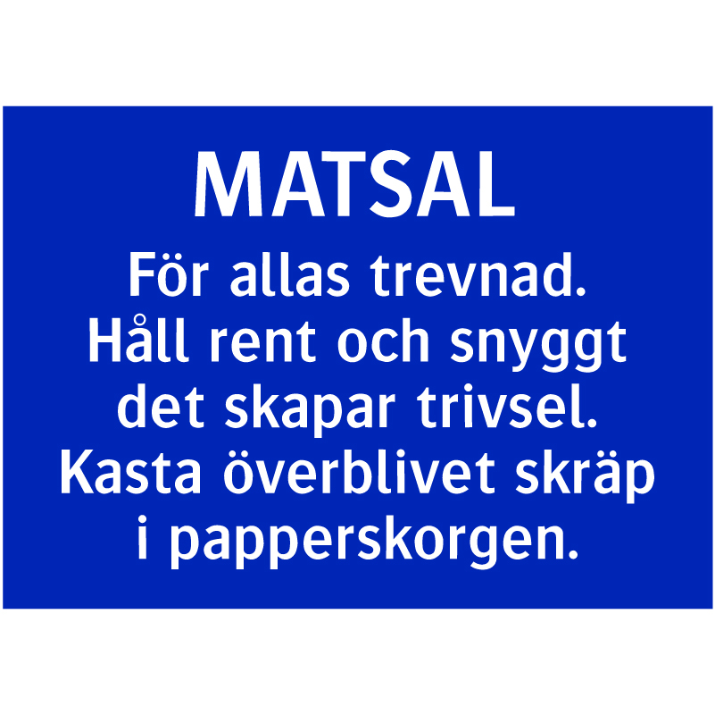 Matsal. För allas trevnad. Håll ren och snyggt det skapar trivsel. Kasta överblivet skräp i papperskorgen.