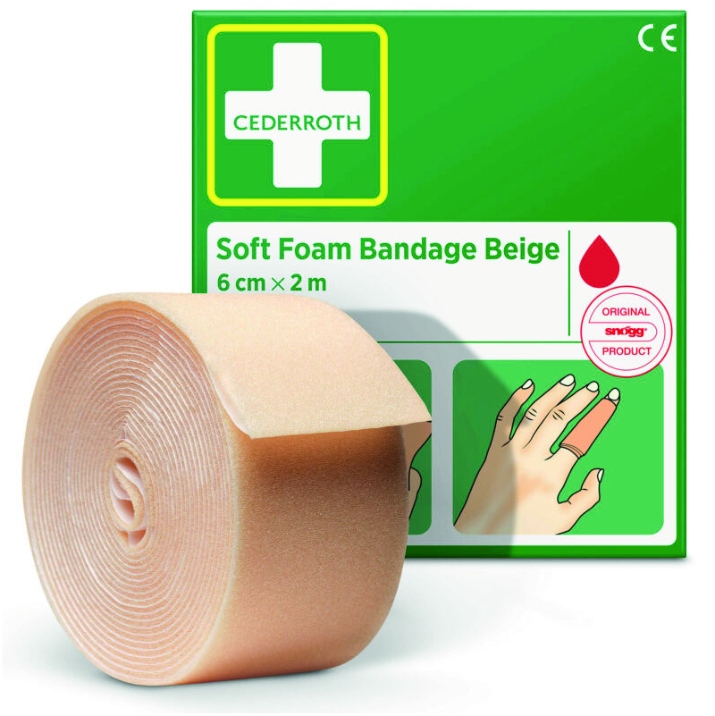 Cederroth Soft Foam Bandage är ett självhäftande limfritt plåster och klibbar därför inte fast i hud eller hår. Riv enkelt av en passande bit och linda runt det skadade området. Den är idealiskt för snabb och enkel sårvård.