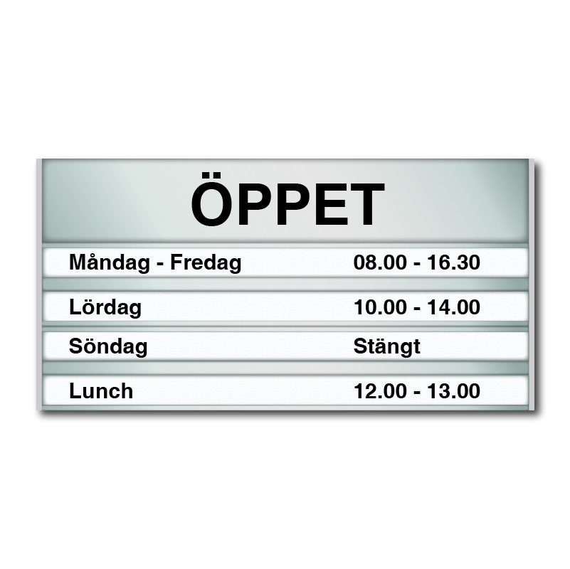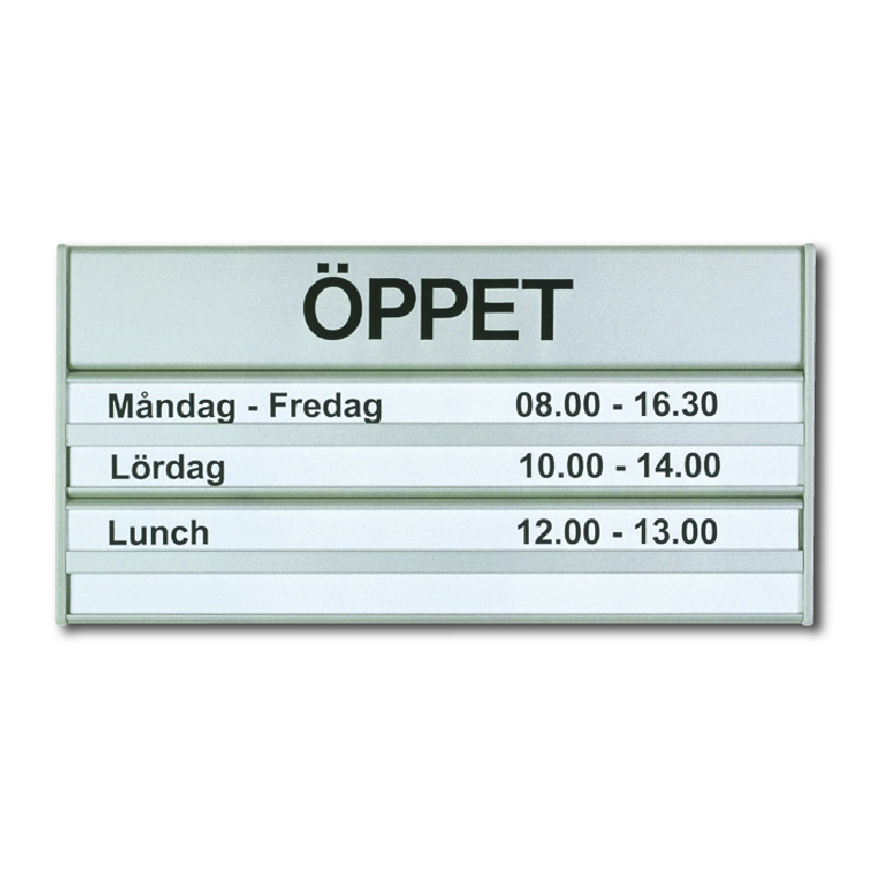 Material: Naturanodiserad aluminium med "ÖPPET" i svart, plastskydd och med plats för 4st utbytbara 12mm-textremsor (t ex Dymo-remsor, OBS! Ingår ej).Mått: 180x93mm